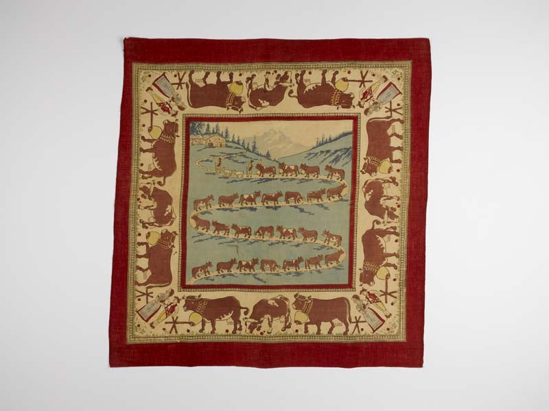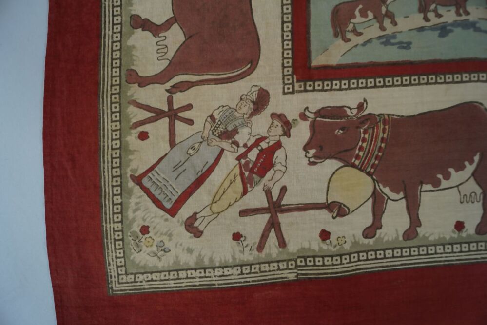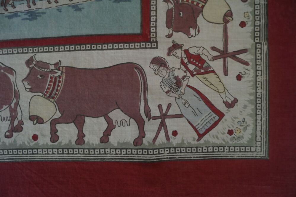 Souvenirdoek met bedrukte voorstelling van koeien in de Alpen, met rode rand