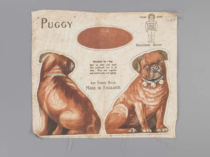 Katoenen doekje bedrukt in zwart, bruin en lichtblauw met een buldog, opschrift PUGGY, verder gebruiksaanwijzing hoe het doekje te gebruiken