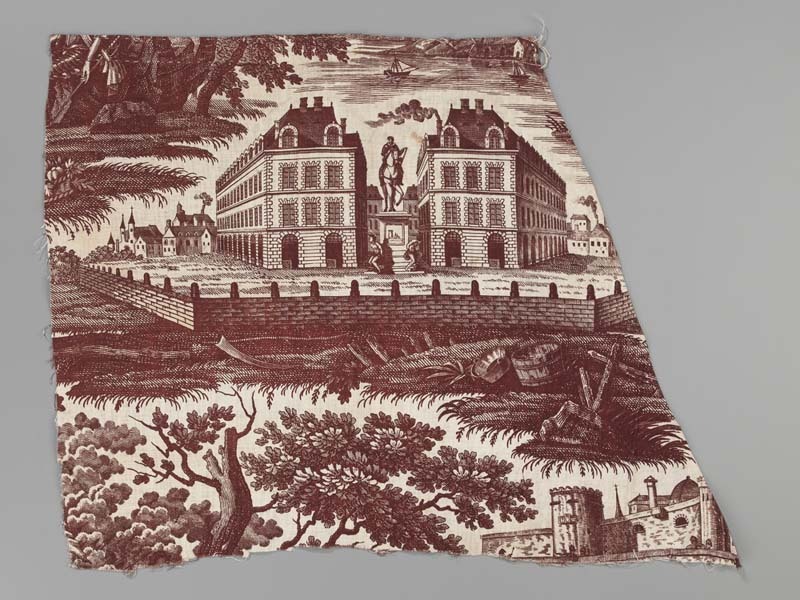 Kleine lap katoen, bedrukt in bruinrood met voorstellingen, van een slag, kasteel, kerk enz., hoort bij grote lap