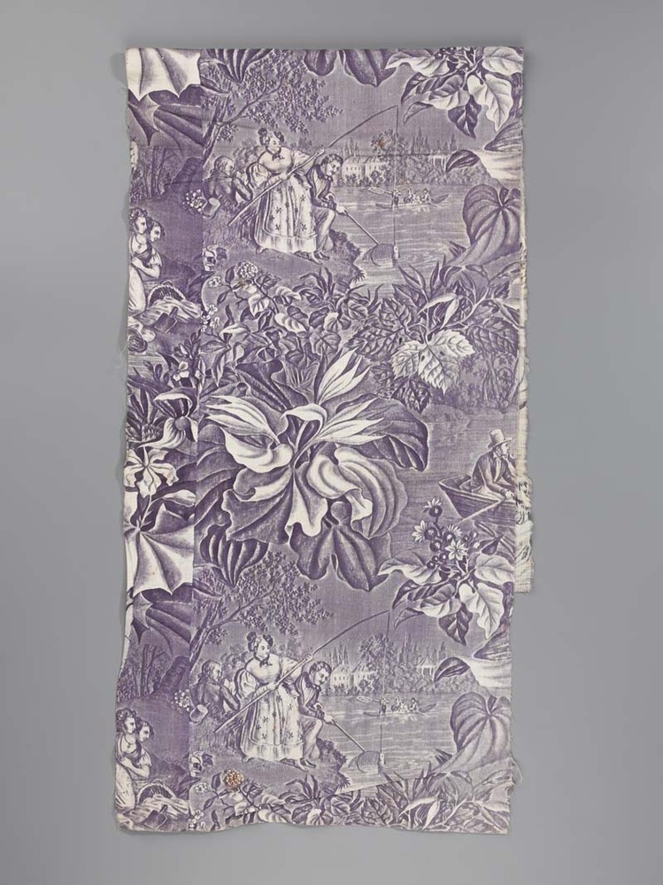 Reep katoen, bedrukt in paars met de voorstelling van een vissend gezelschap, nog een groot stuk (fragment)