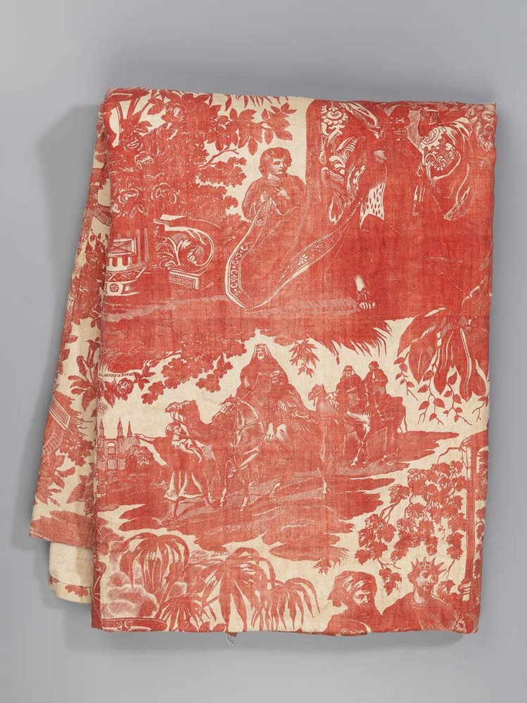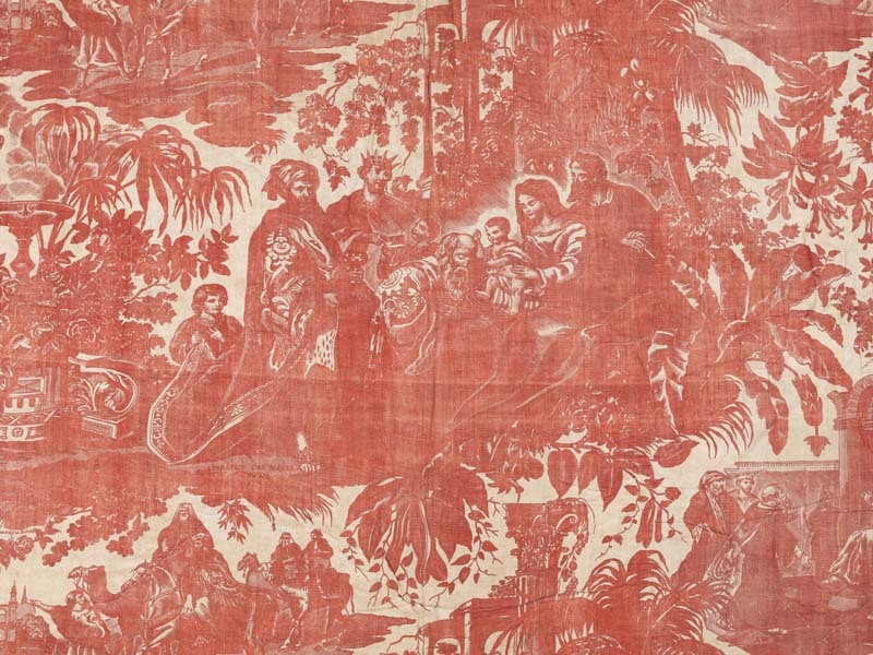 Gevoerd stuk katoen, bedrukt in steenrood en wit met voorstellingen van de aanbidding