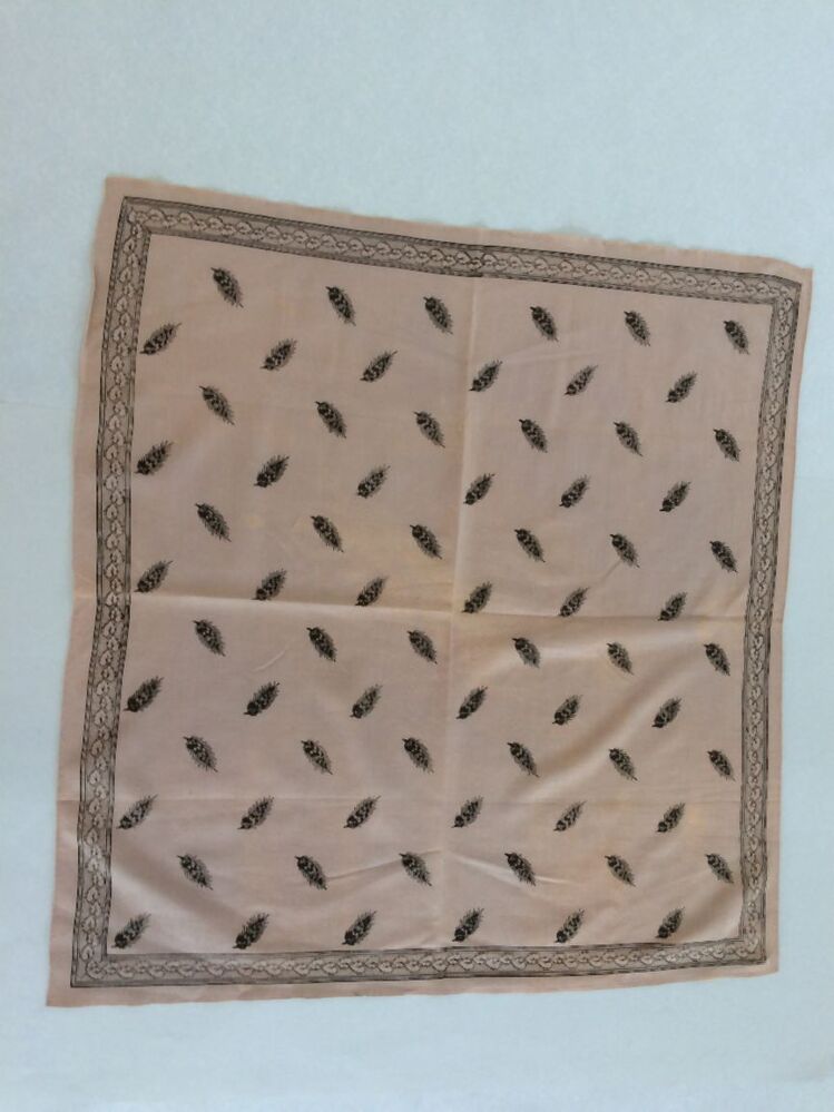 Vierkante wollen doek in beige kleur, bedrukt met zwarte veervormige blaadjes, langs de zijden een smalle rand met bladerpatroon