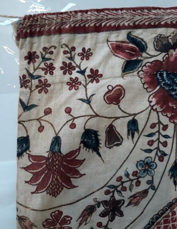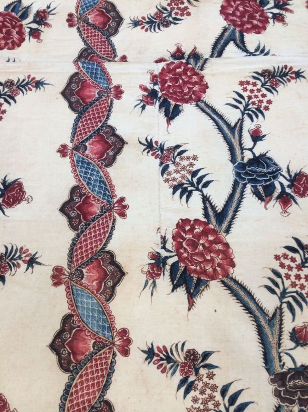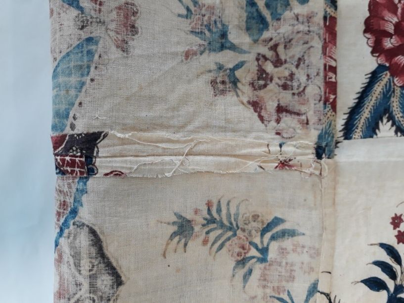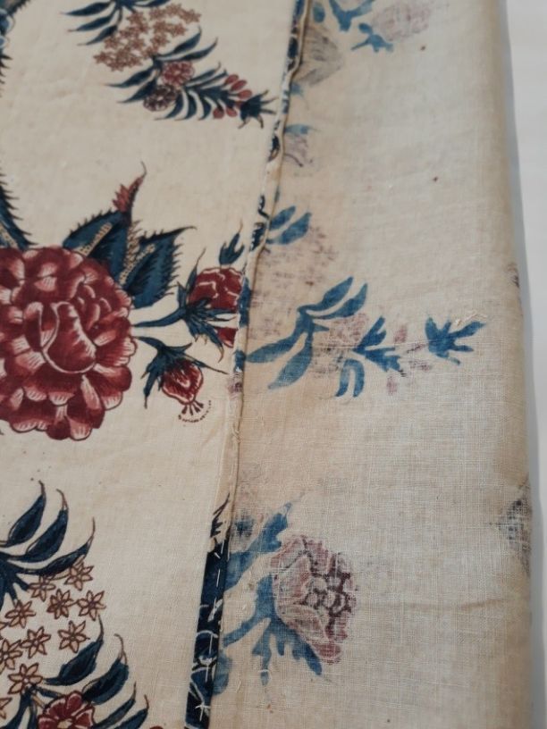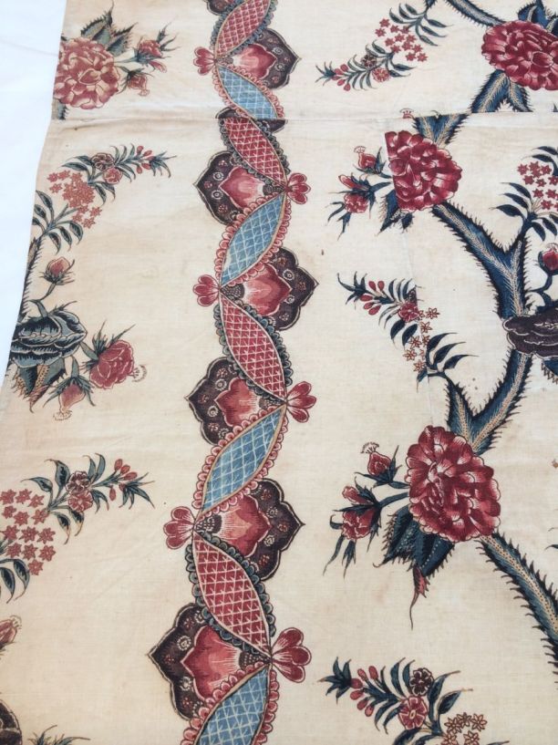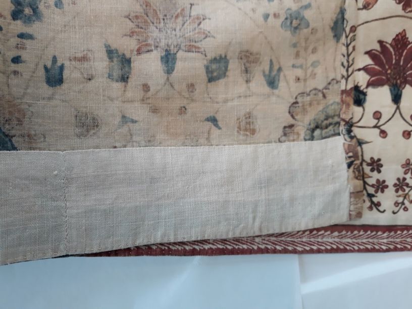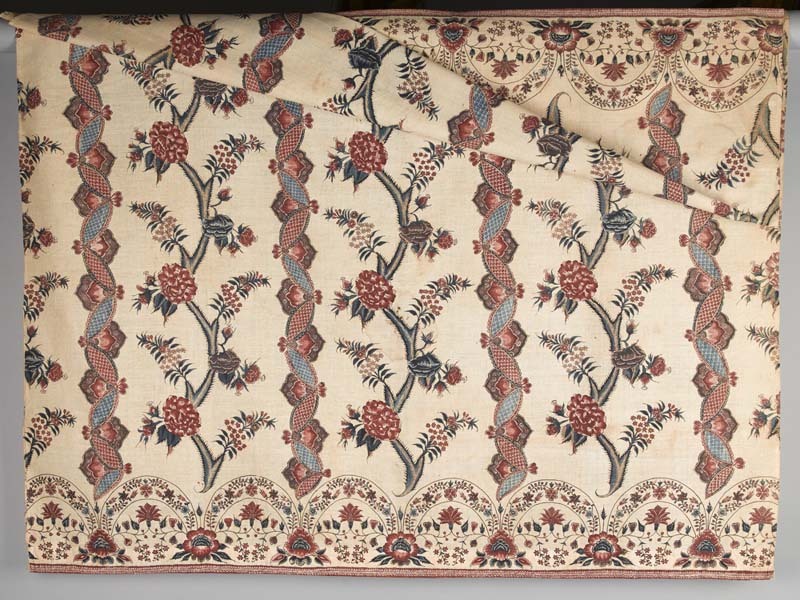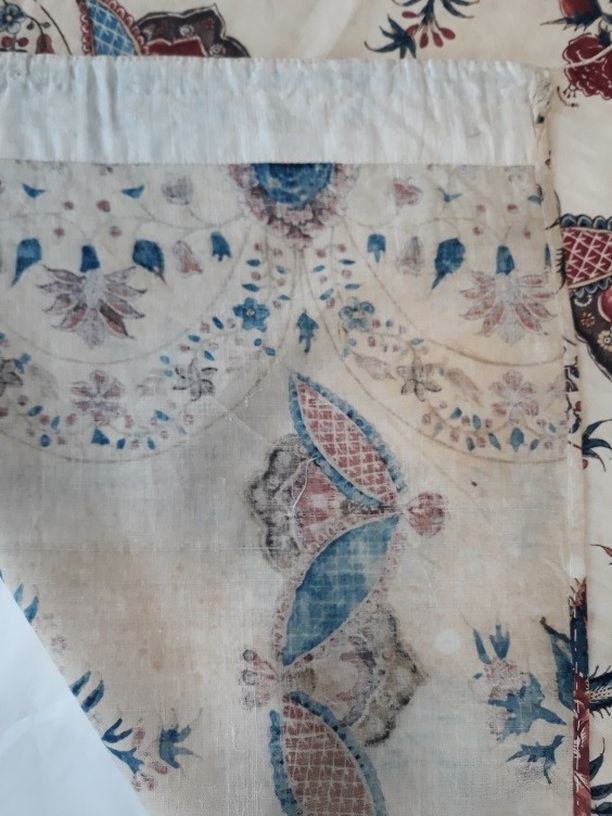 Sitsen gordijn vervaardigd van randstof met bloemenbogen langs zoom en afwisselend verticale banen van doornige bloemtak en geschakelde spitsovalen op witte grond