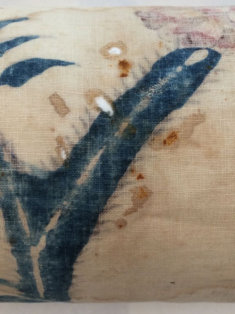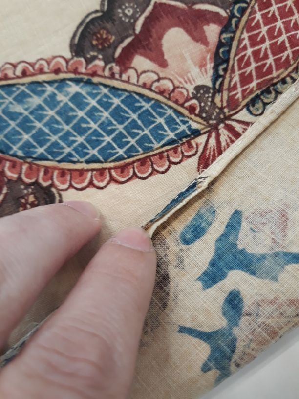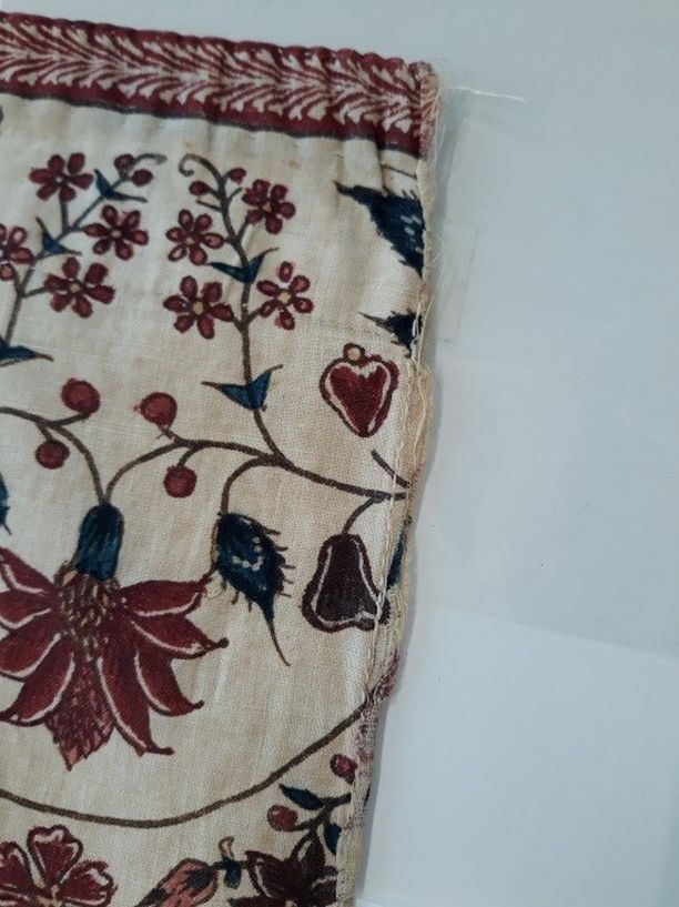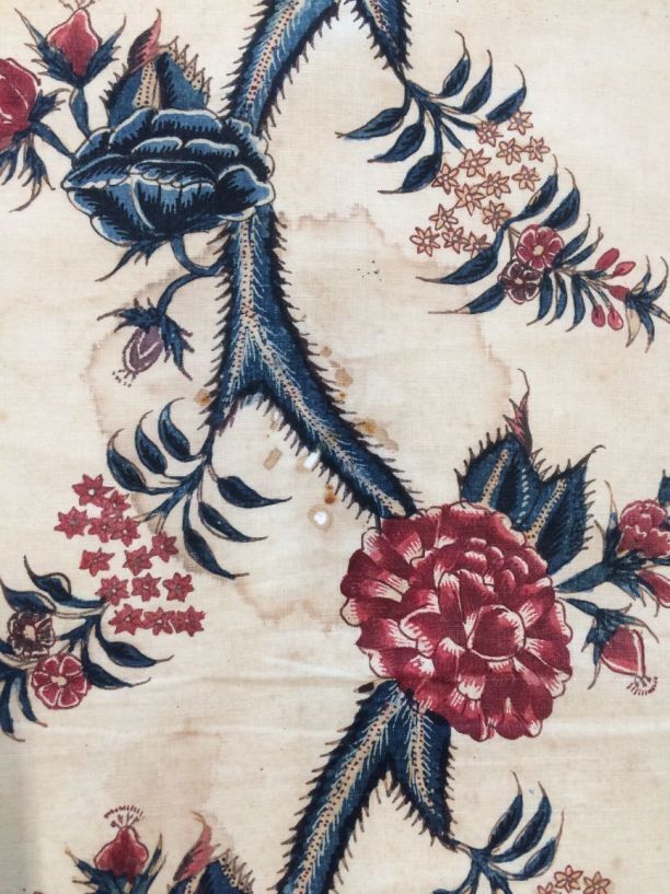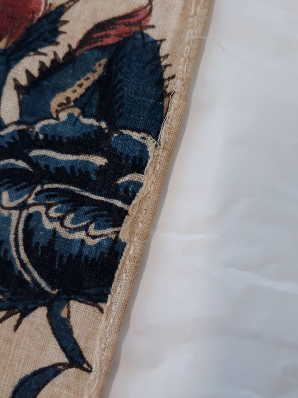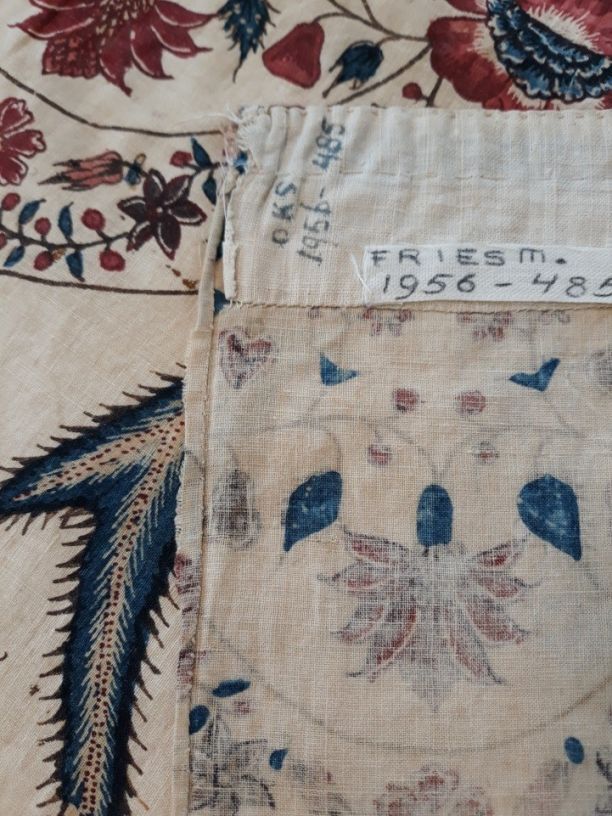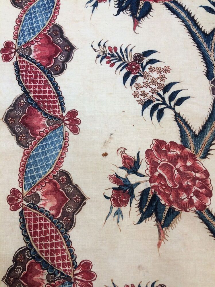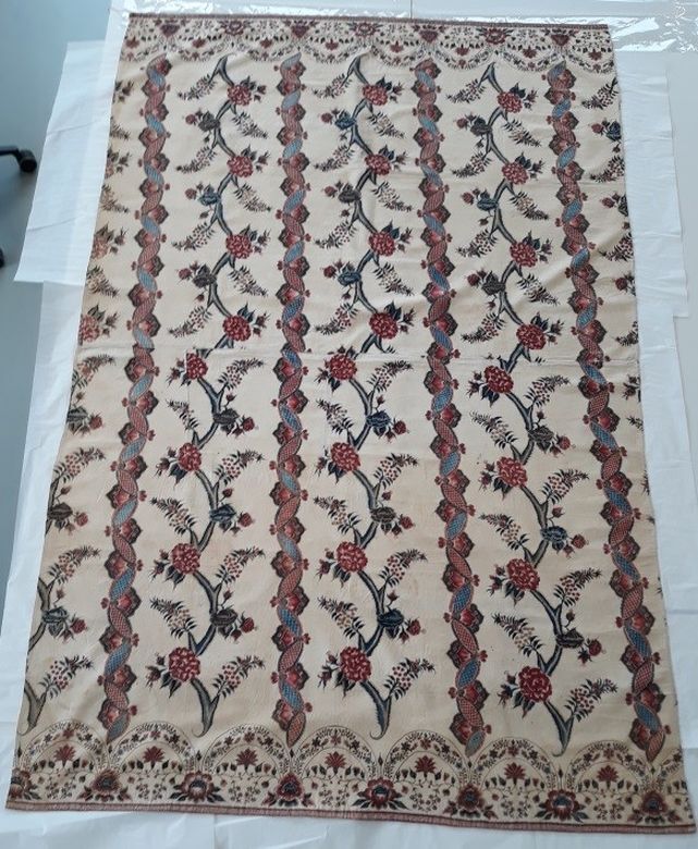 Sitsen gordijn vervaardigd van randstof met bloemenbogen langs zoom en afwisselend verticale banen van doornige bloemtak en geschakelde spitsovalen op witte grond