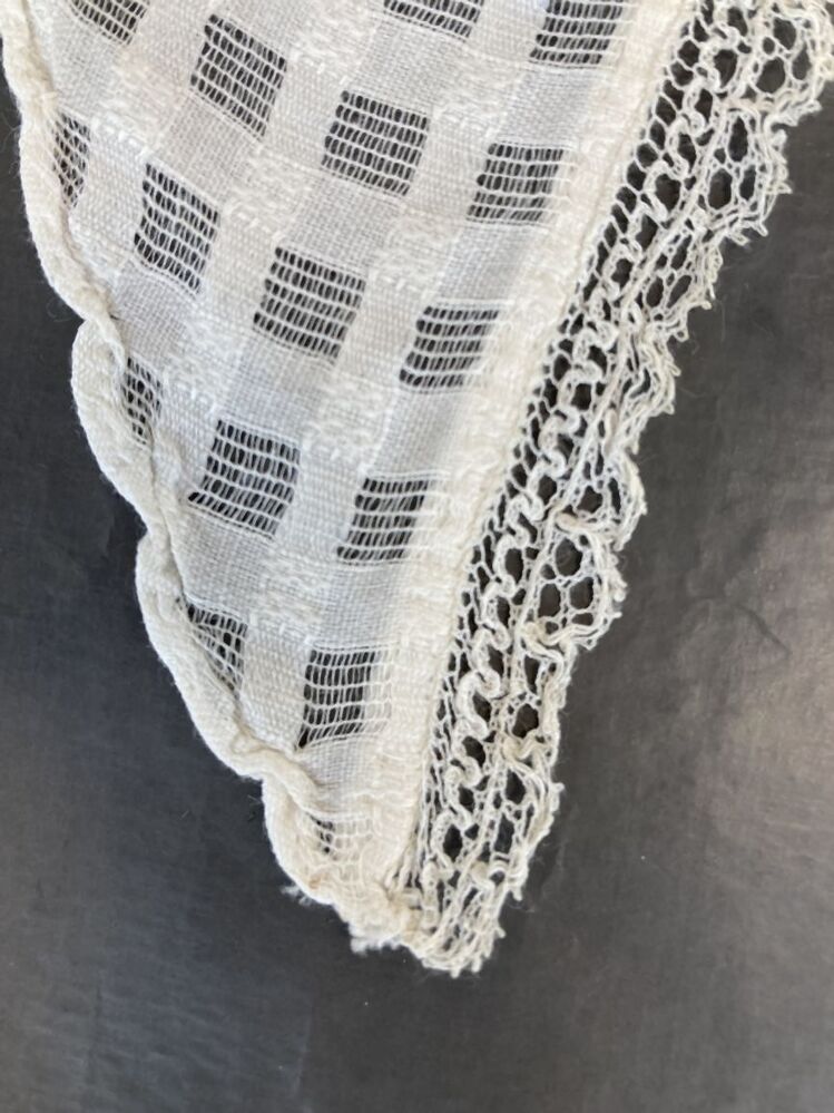 Driekantig omslagdoekje (fichu) van wit neteldoek met hokjespatroon en langs de zijden een smal kantje