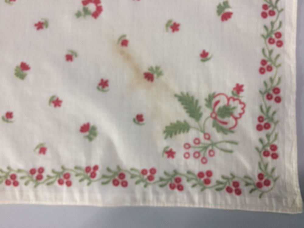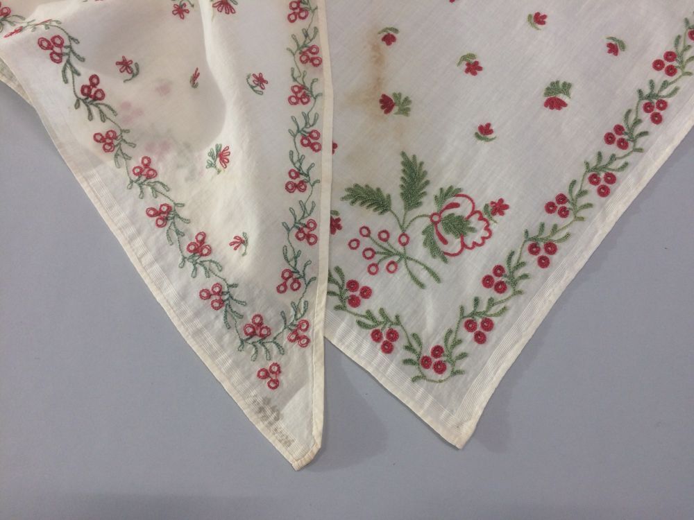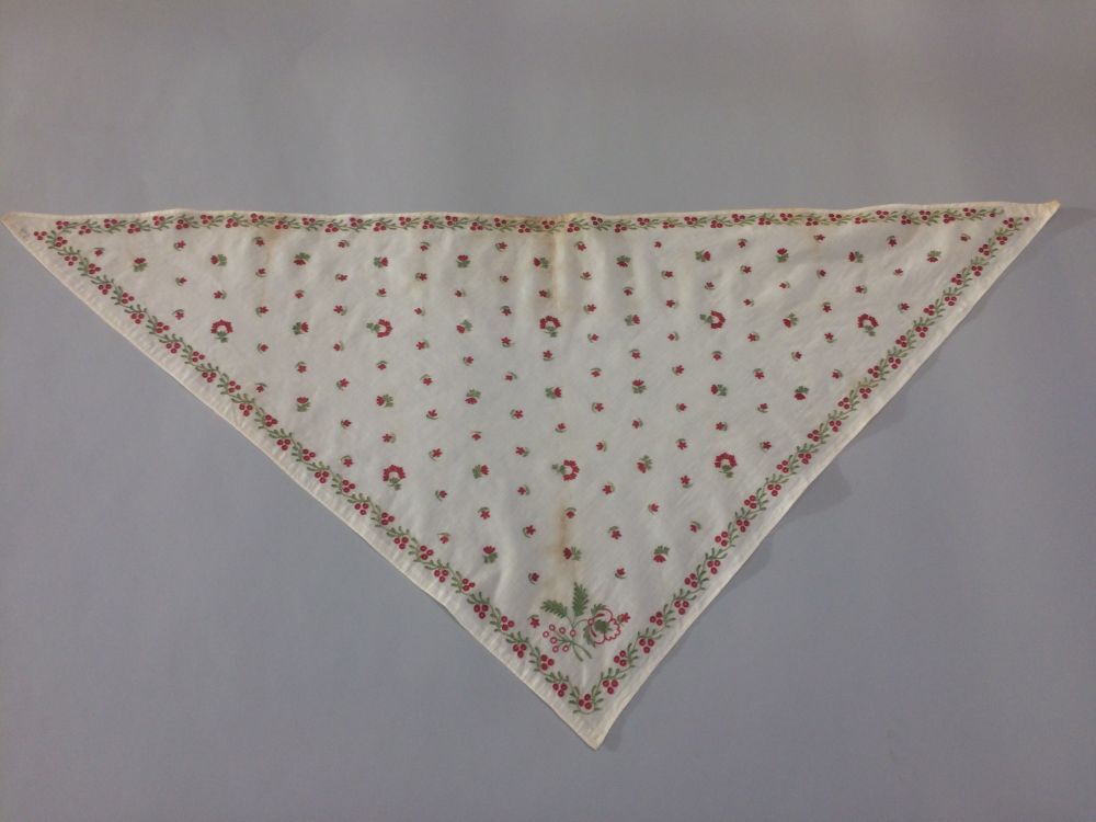 Driehoekige fichu met rode en groene bloempjes en rand rondom met besjes