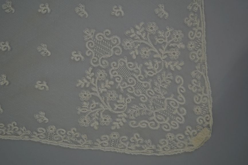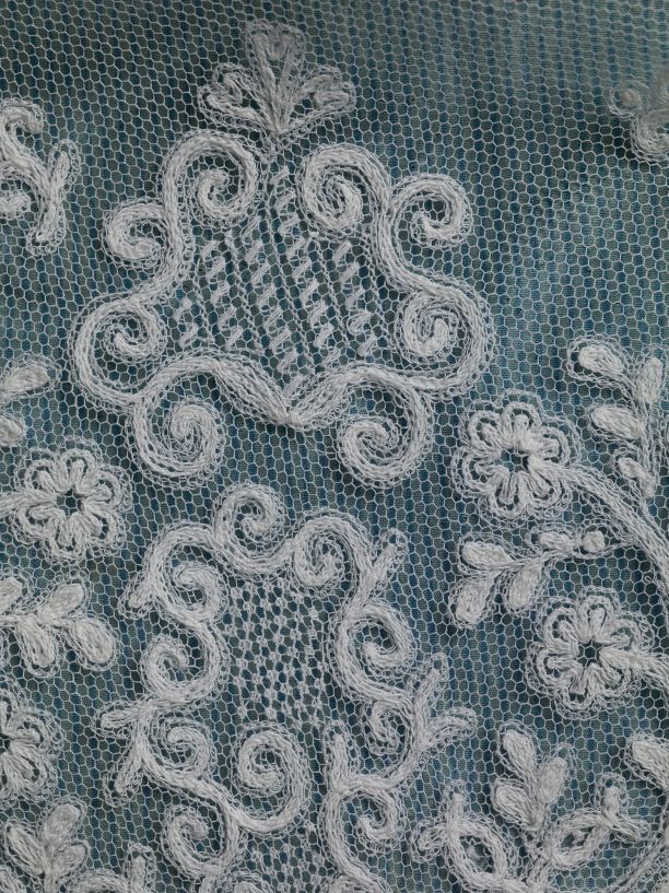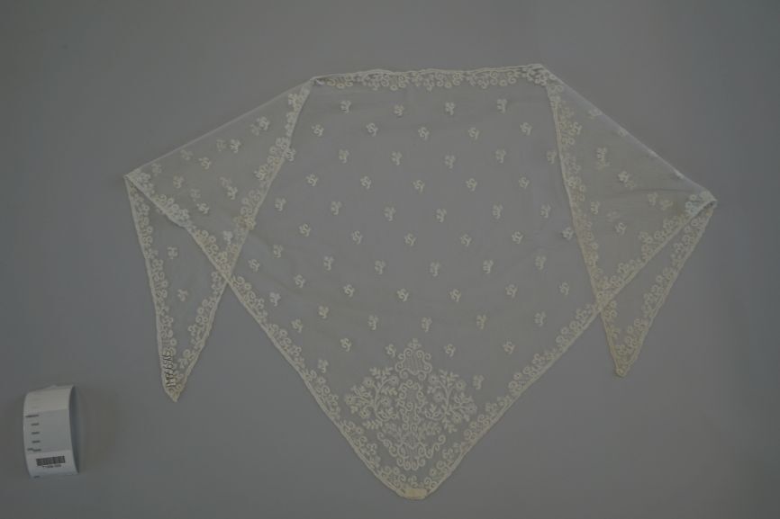 Fichu versierd met tamboereerwerk met dik en dun garen met schaduweffect