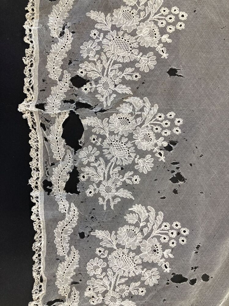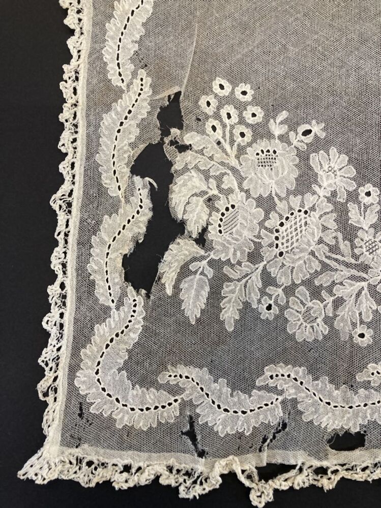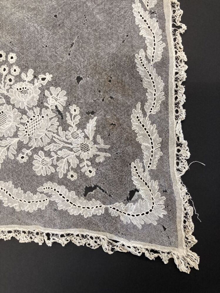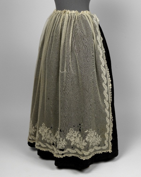 Vierkante tulen schort, met bloem en bladmotieven bewerkt en ajour kanten randje