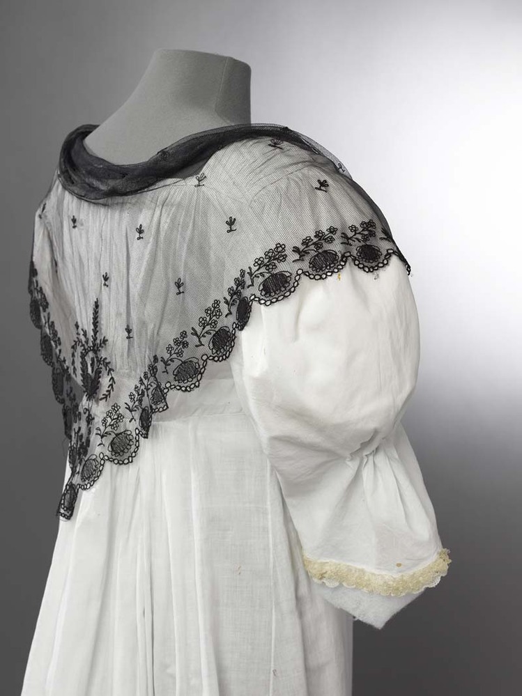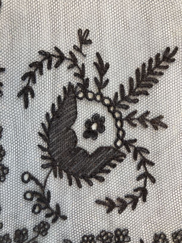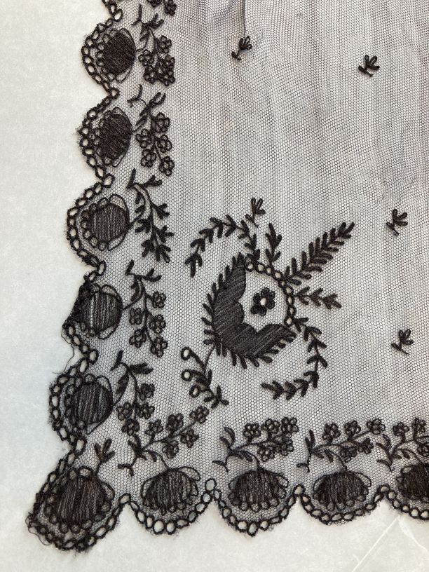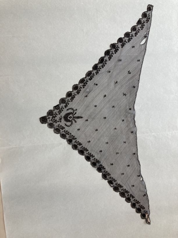 Driehoekig omslagdoekje (fichu), van zwarte getamboereerde tule met ajour golfrand