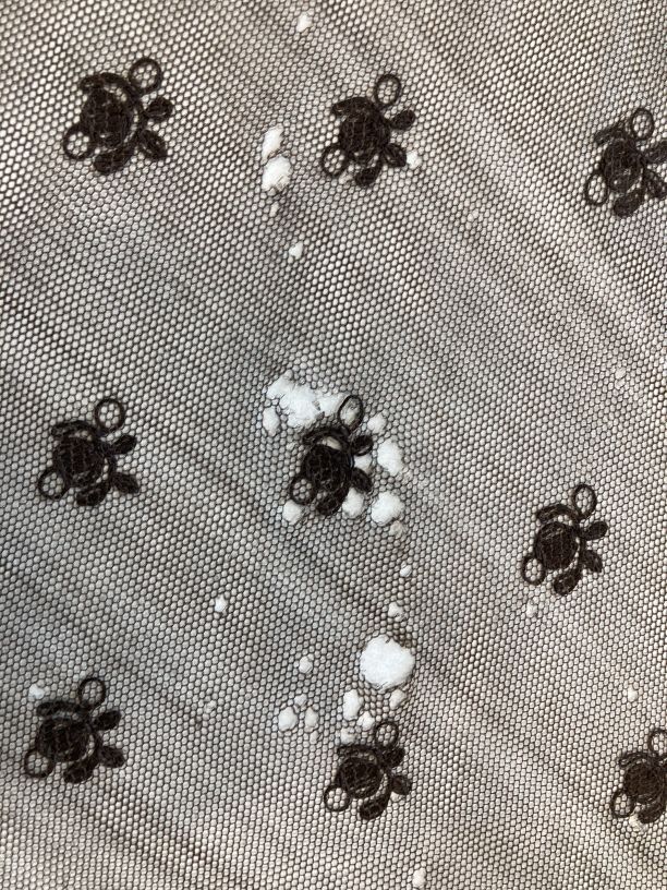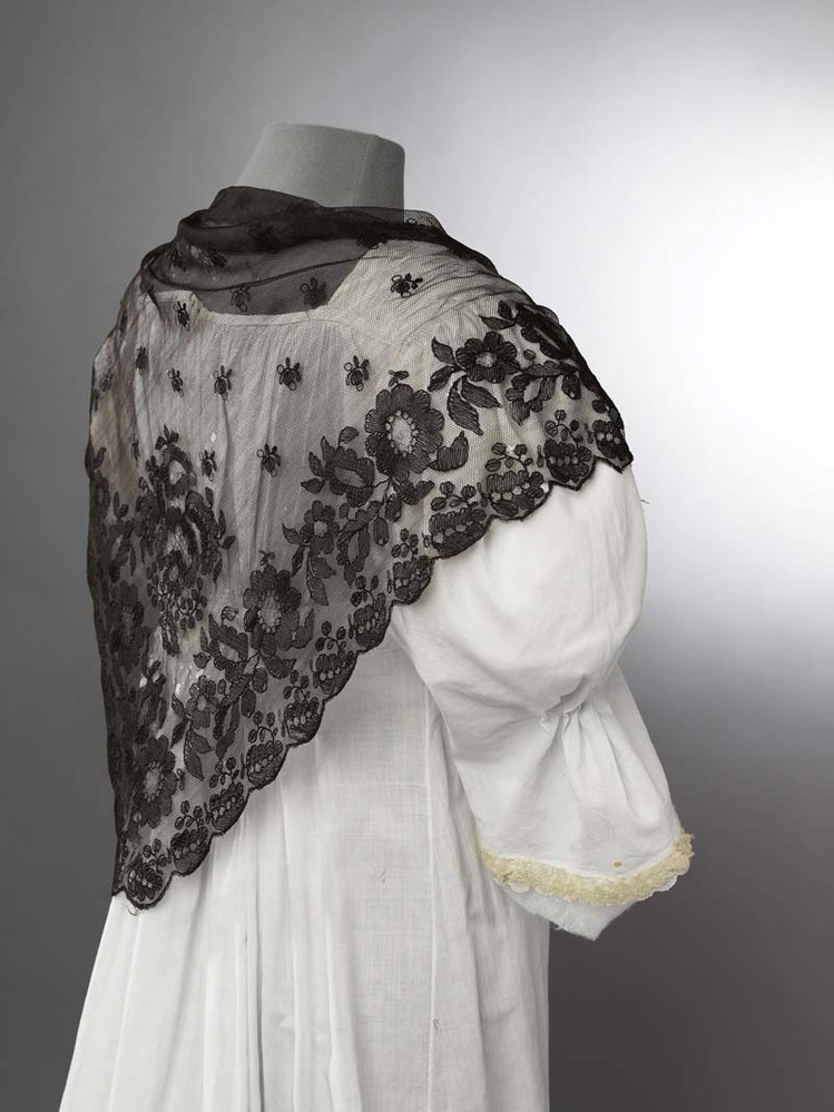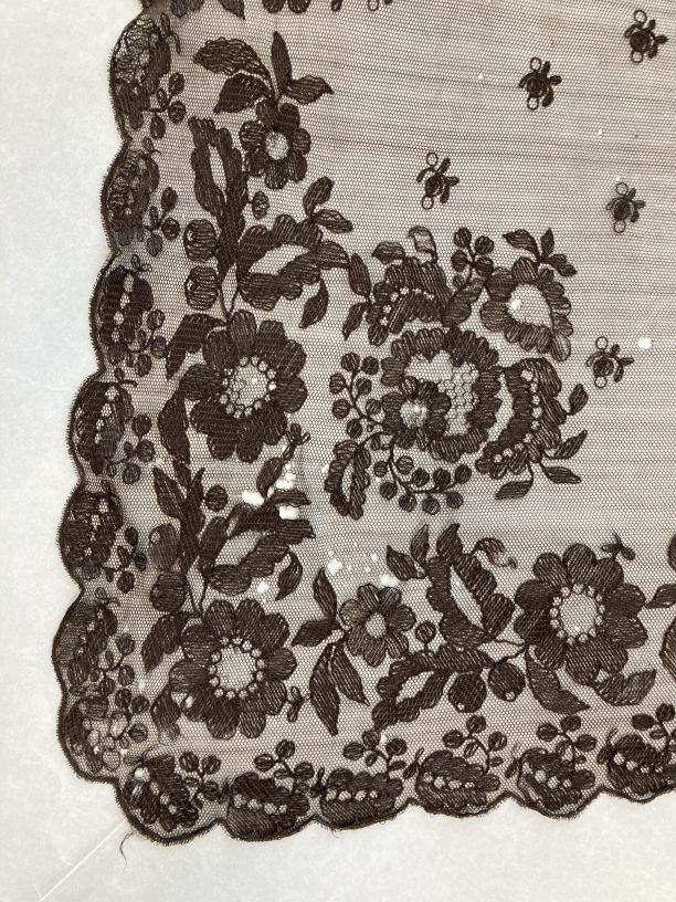 Driehoekig omslagdoekje (fichu), van zwarte benaaide tule met schulprand, groot bloempatroon