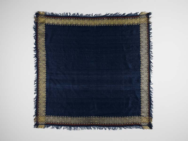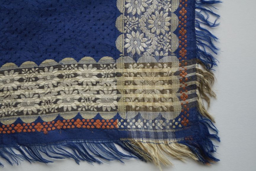 Blauwe zijden sjaal met bloemenrand in creme en rood, met aangeweven franje