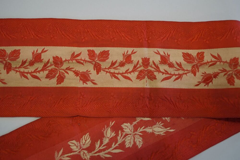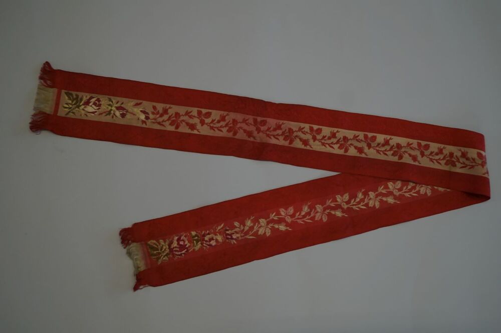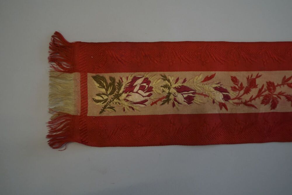 Smal rood zijden sjaaltje met franje, in het midden een lichte baan met ingeweven bladrank
