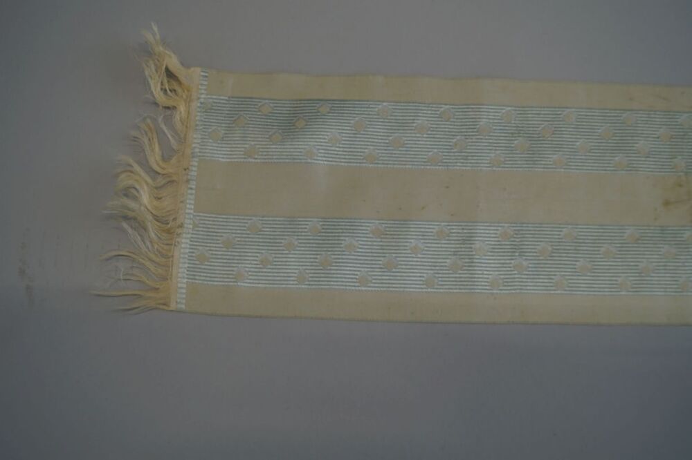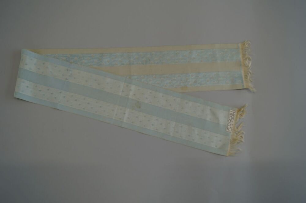 Lichtblauw zijden sjaaltje met franje met beurtelings een witte en lichtblauwe baan en in de lichtblauwe baan witte ruitjes