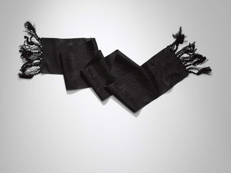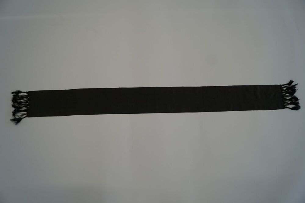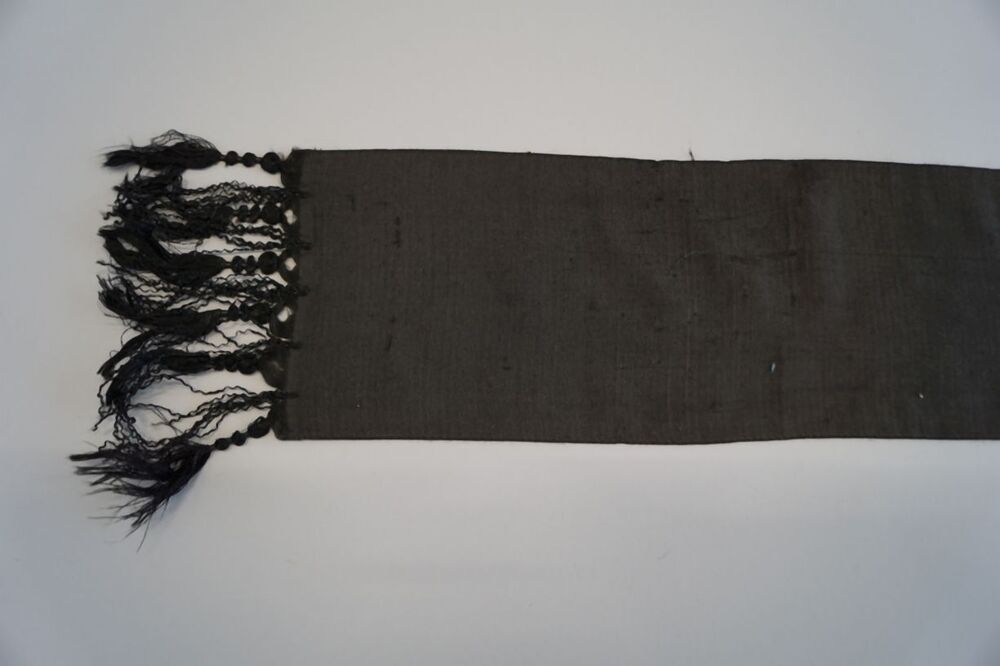 Zwart zijden rouwsjaaltje van lint afgewerkt met een geknoopte fantasiefranje