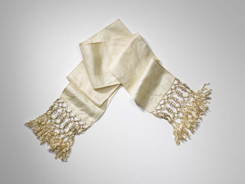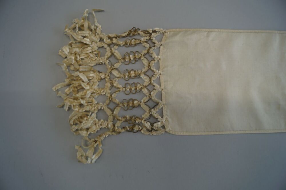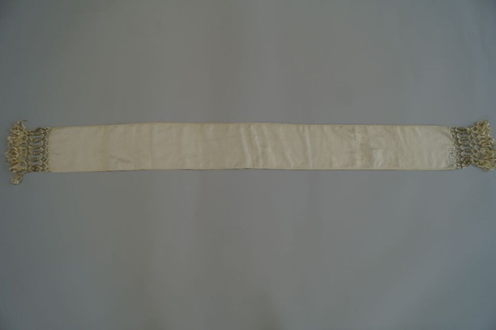 Smalle sjaal van crèmekleurige zijden stof met geknoopte franje met gouddraad en chenilledraad