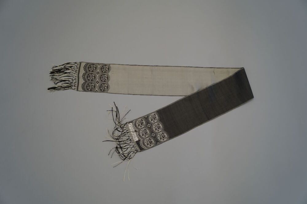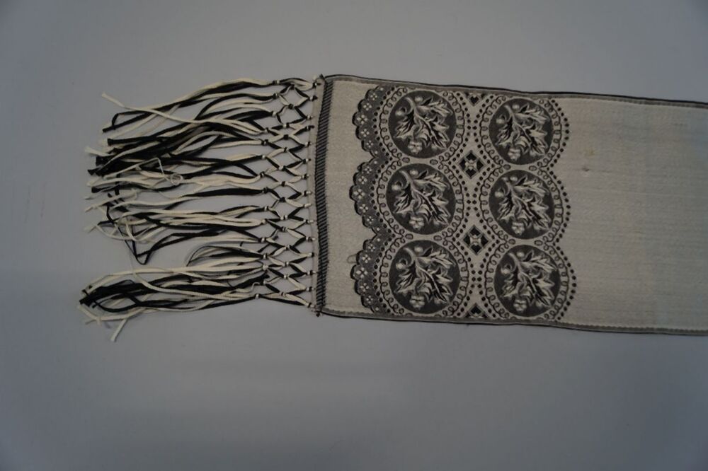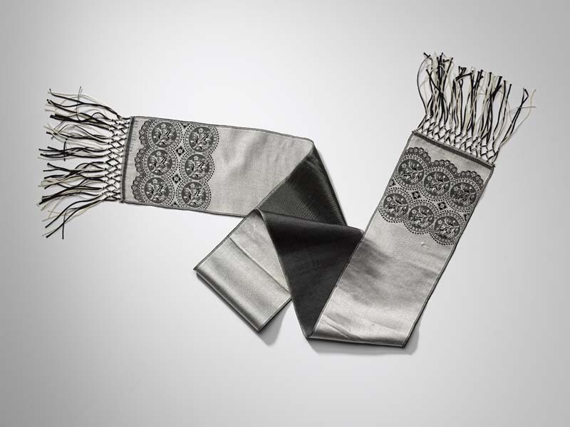 Zijden sjaal van een lint in de kleuren zilverwit en zwart met fond van wit met ingeweven motieven aan de uiteinden en geknoopte franje