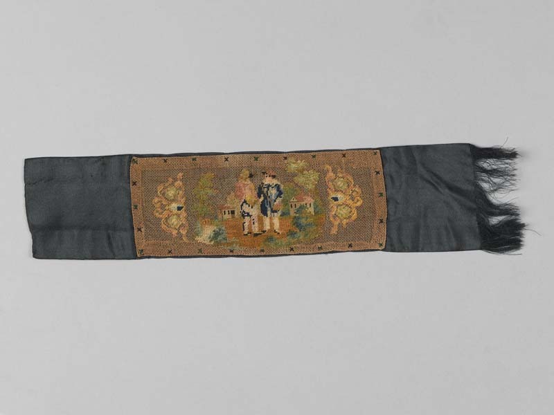 Groen zijden lintje met hierop gestikt een stukje tule waarin een landschapje met twee personen geborduurd in blauw, geel en bruin