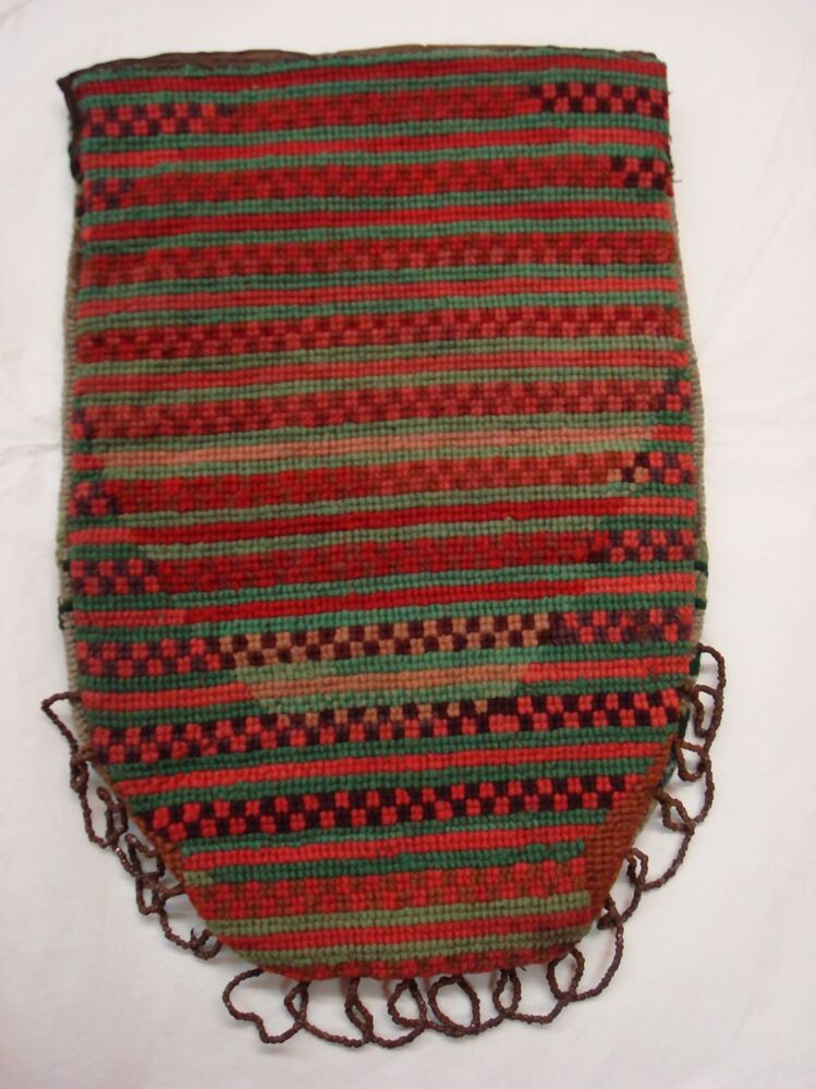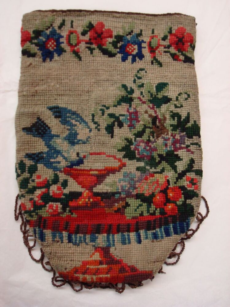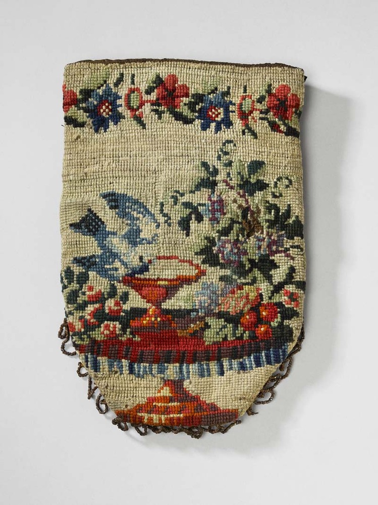 Tasje in tapisserie waarop afgebeeld een tafel met vaas waaruit vogel drinkt, bloemstuk en bloemrand