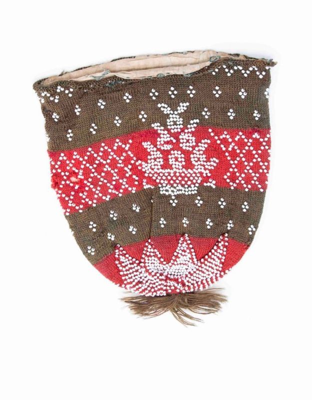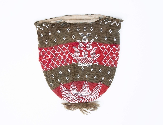 Tasje gebreid in tricotsteek in de kleuren rood en bruin, witte vormen een ornament en een bloemenmand