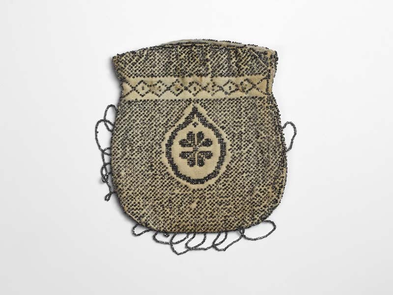 Wit katoenen tasje met zwart-zilverkleurige opgenaaide kraaltjes, in het midden een bloem in een spitsovaal