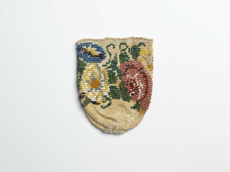 Wit katoenen gebreid beursje met kralen, zonder beugel, onder stervorm, bloemenpatroon rood, geel, groen en blauw
