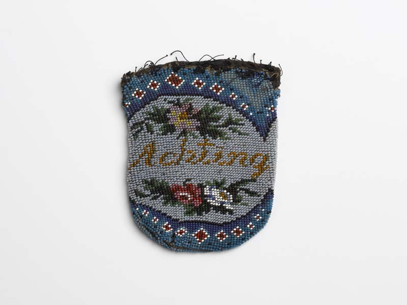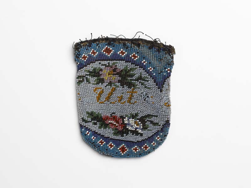 Tasje van kralenbreiwerk zonder beugel met de tekst: Uit Achting, grijs fond en bouquetjes rozen boven elkaar