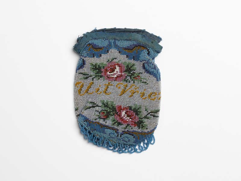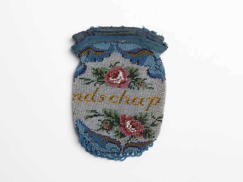Beursje van kralenbreiwerk, rozen, met gele tekst: Uit Vriendschap, zonder beugel, grijs fond, blauwe wolkenbanden, boven en onder roosjes