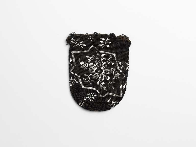 Tasje gebreid met kralen. voering van bruin linnen, losgeknipt van beugel, zwart fond, witte achtpuntige ster, met daarin en daaromheen witte bloemen