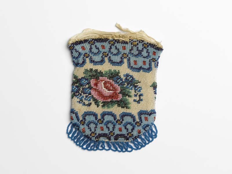 Een beurs van kralen breiwerk, zonder beugel, blauwe randen, witte grond met rozen