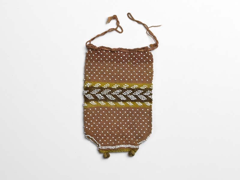 Tasje gebreid met zijde en kraaltjes, in de kleuren geel, rood en bruin