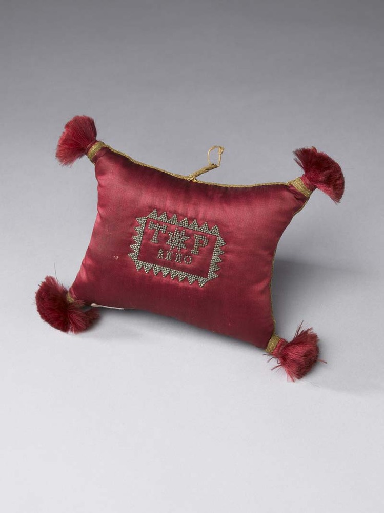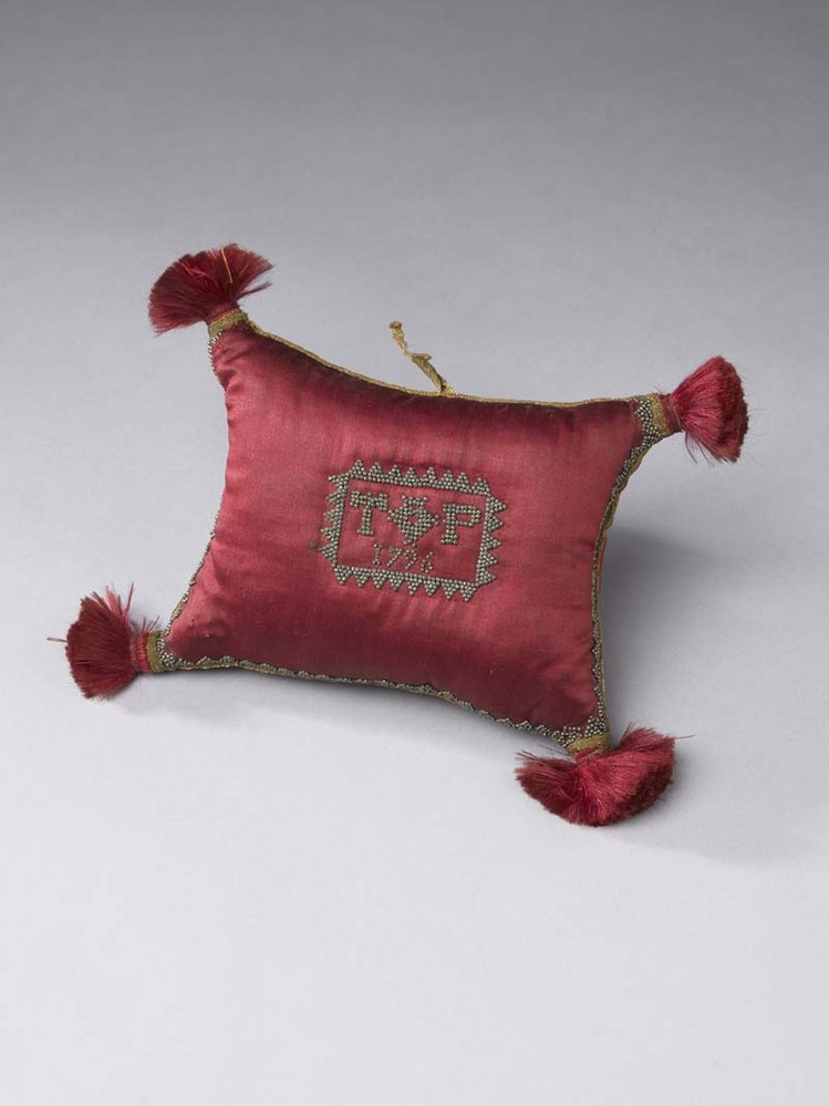 Een speldenkussen van rood satijn met aan de zijkanten afgezet met goudband, in de hoeken kwastjes