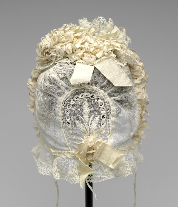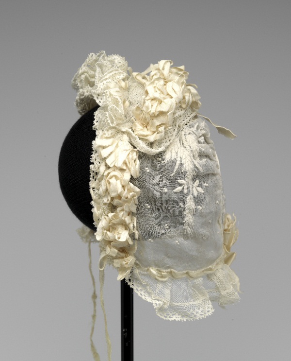 Neteldoeken kindermutsje, versierd met zijden strikjes en kanten randjes
