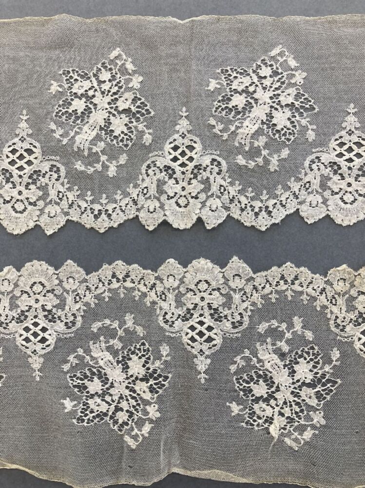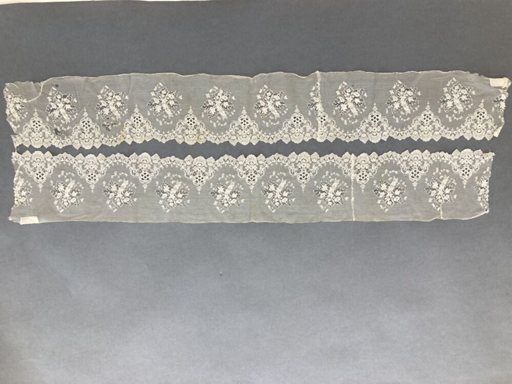 Twee stroken machinale kant, gebruikt als mouwlubbe, met geschulpte randen