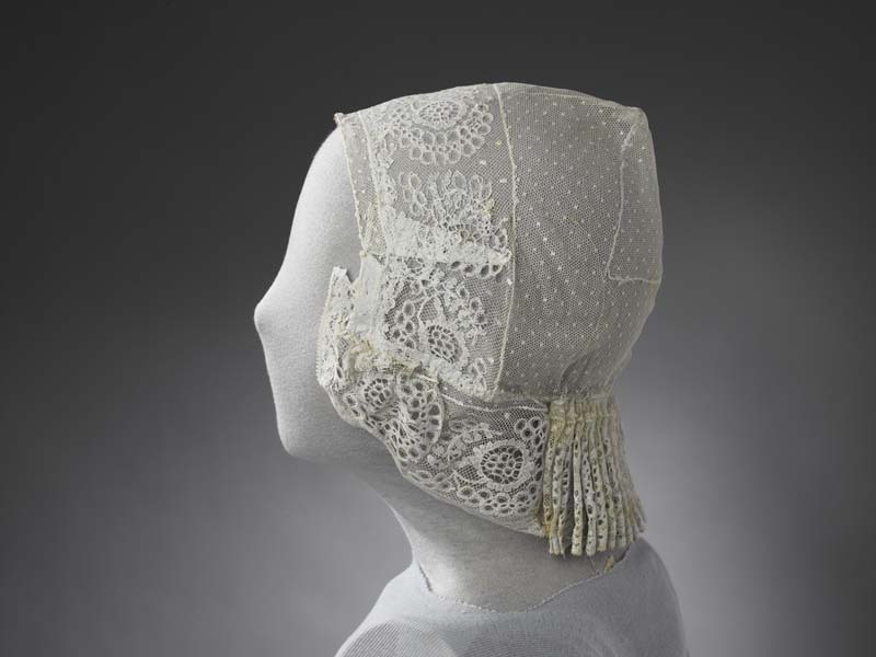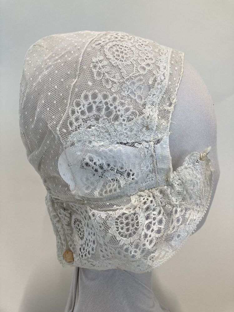 Kanten Amelander muts met genopte bol en gebloemde kantstrook