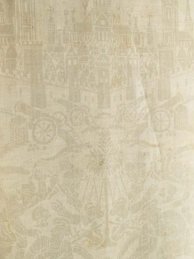 Tafellakens van damast, met o.a. voorstelling van ruiters te paard met bazuin blazende engelfiguren daarboven, onderdeel van groep van twee