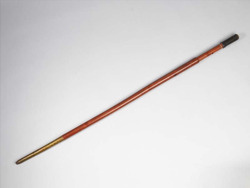 Grote wandelstok, grote messing puntbeschermer, leren polsriempje en gevlochten leren greep