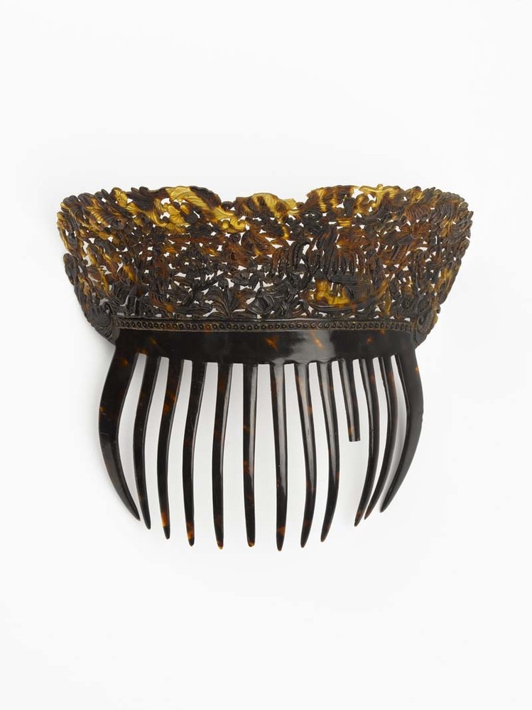 Grote donkerbruine schildpad opsteekkam met dertien tanden en ajour gewerkte greep