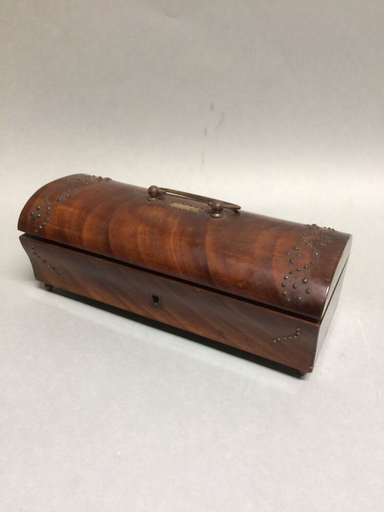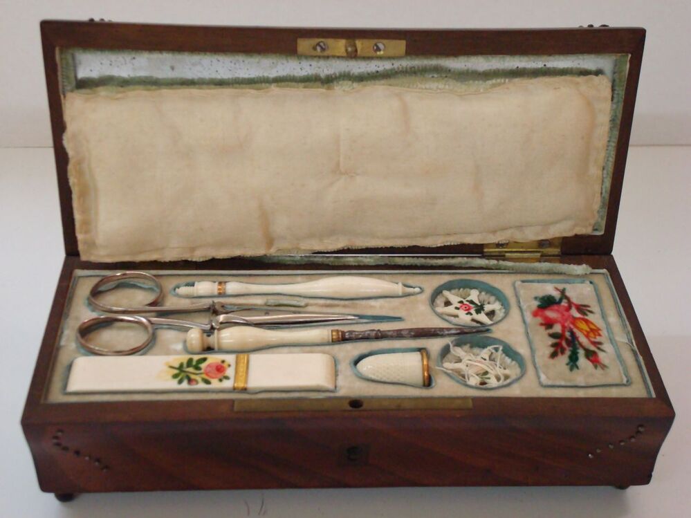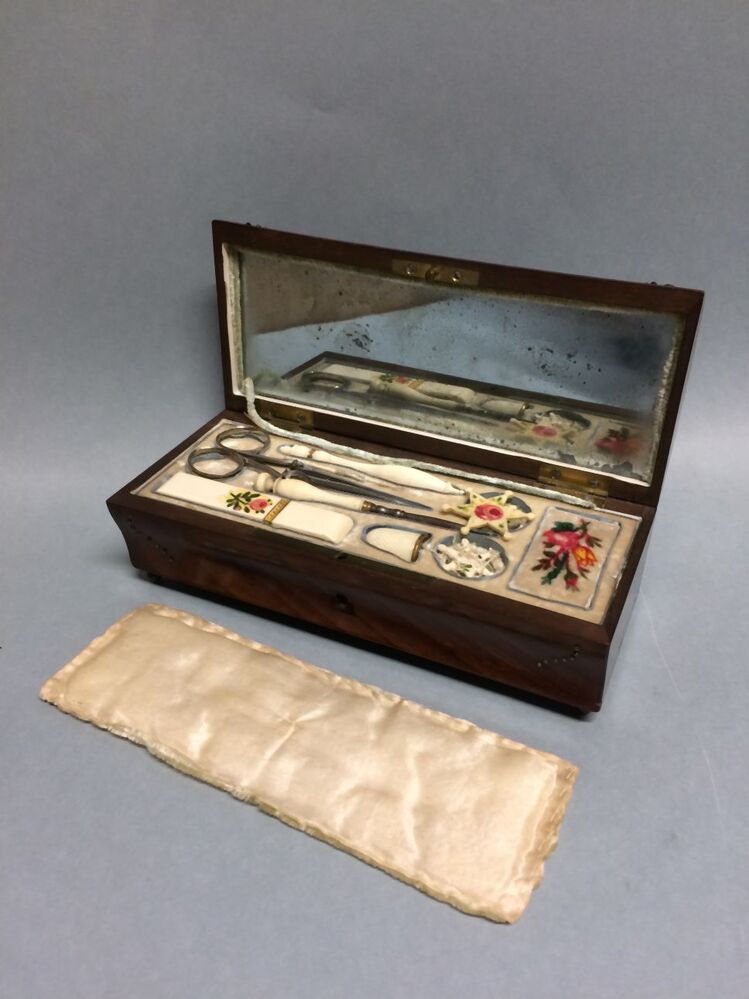 Rechthoekig notenhouten borduurdoosje, het deksel gewelfd en voorzien van een zilveren handvat, met inhoud