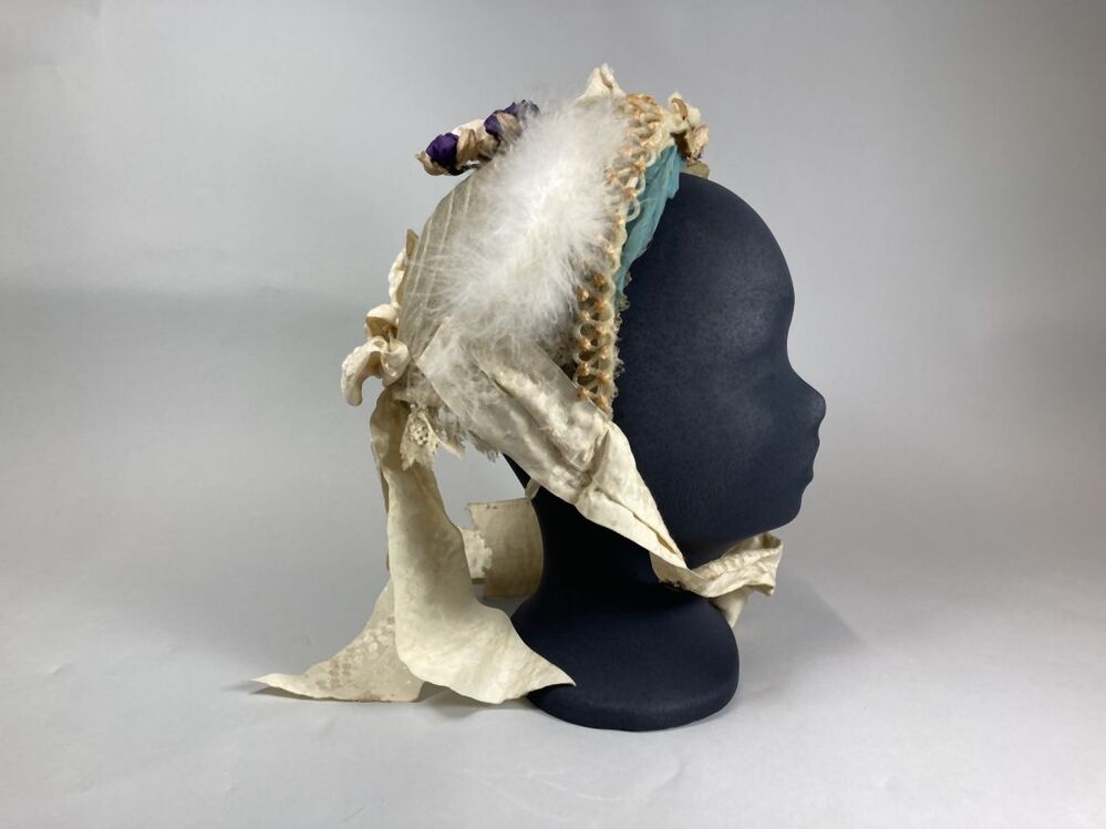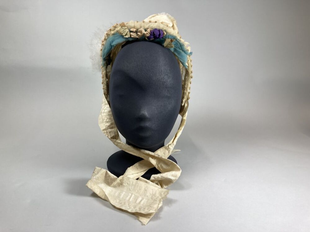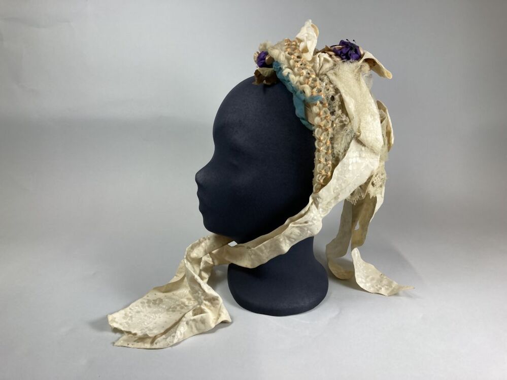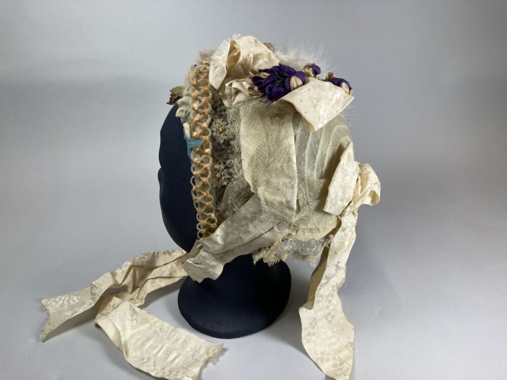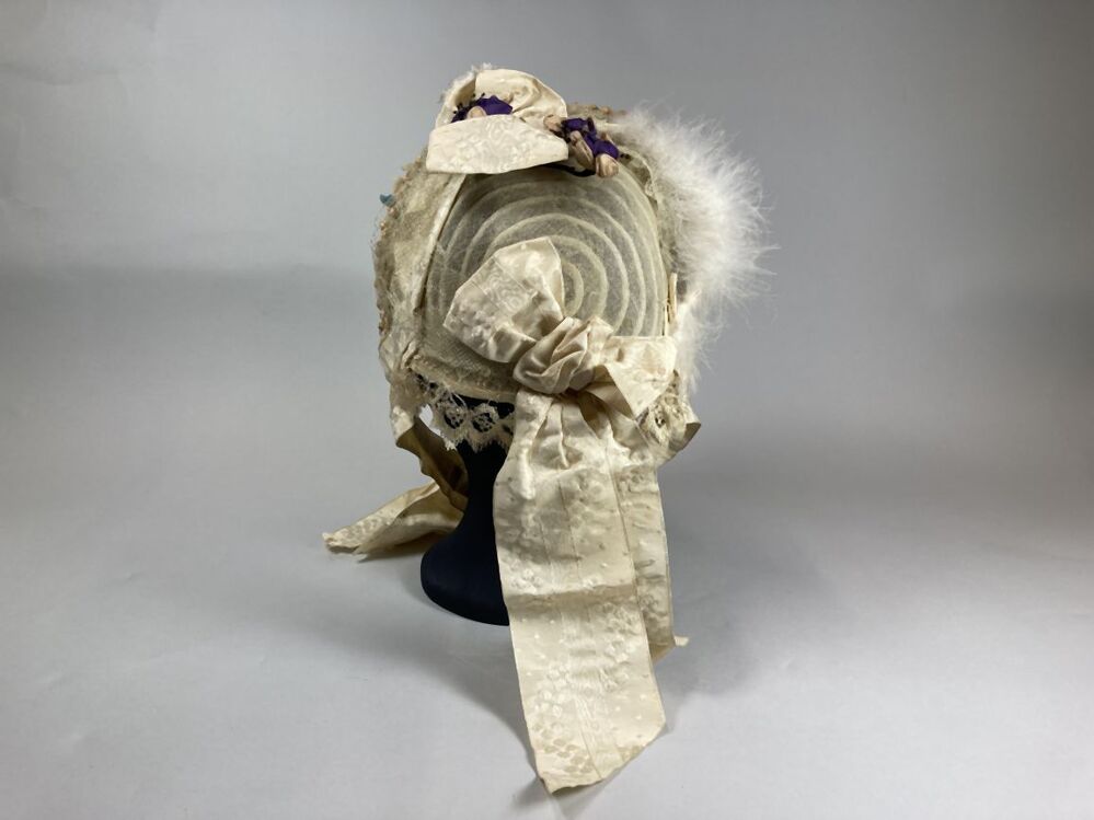 Luifelhoed van crème glanzend meteriaal, in de nek strookje machinaal kant en witte crèpestof voor versierd met kralen, lint en bloemen, corage met paarse bloemen