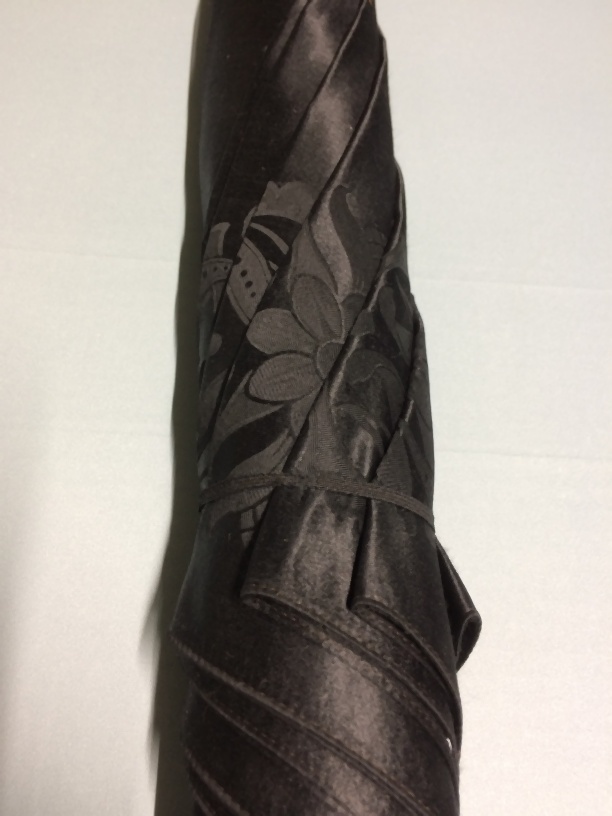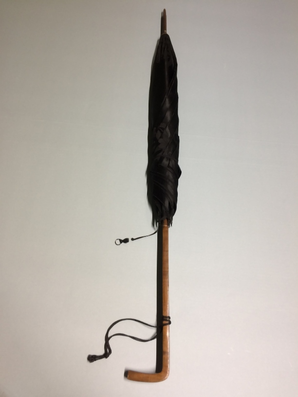 Zwart zijden parasol, langs de rand versierd met bloempatroon, houten stok met lichtbruine haakvormige greep