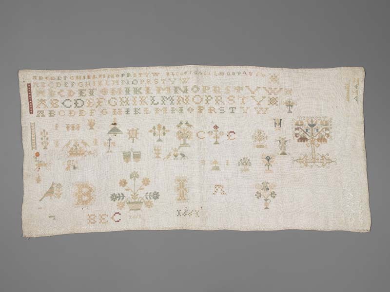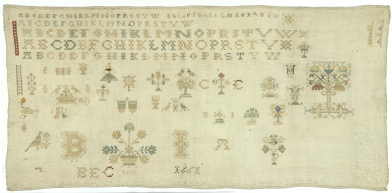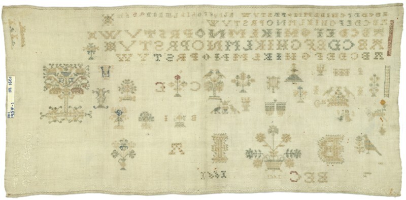 Merkletterlap in pasteltinten met randjes langs de zoom, gemerkt B.I. 1661