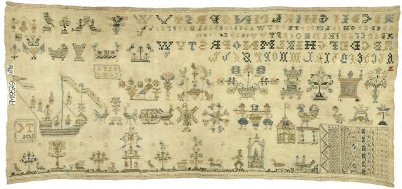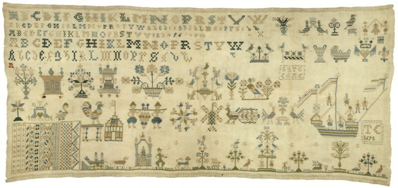 Merkletterlap met randjes, grondje en een schip, gemerkt T.C. 1698