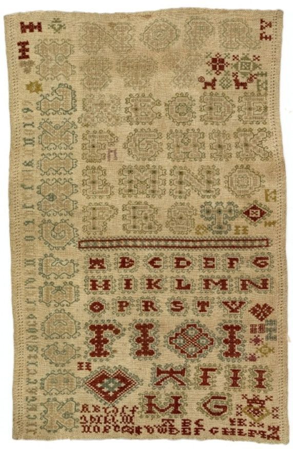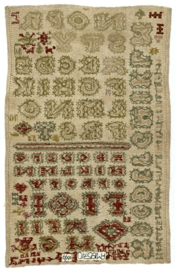Lettermerklap in beige, rood en groen, gemerkt Ick Garritsdochter van Molqueren, anno 1699