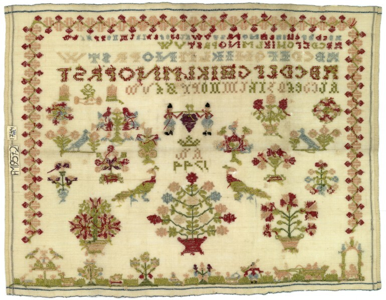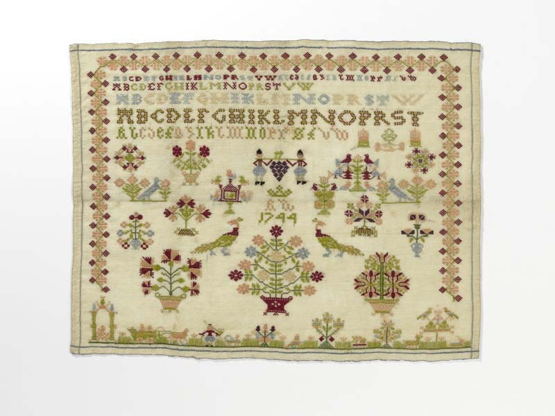 Merkletterlap in felle kleuren roze, karmijnrood, appelgroen en lichtblauw, gemerkt A.W., 1744