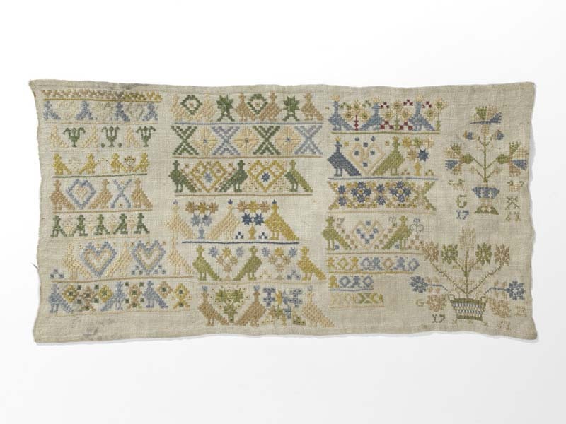 Textielwerken, meestal van fijne stof, waarop door vrouwen en meisjes in verschillende steken is geborduurd en die bedoeld zijn om in te lijsten. Ze werden doorgaans gemaakt door beginnelingen om hun vaardigheden te tonen. Kenmerkend zijn een combinatie van steken, motieven, letters en verzen, en vaak de voltooiingsdatum en de naam van de borduurster. (AAT-Ned)