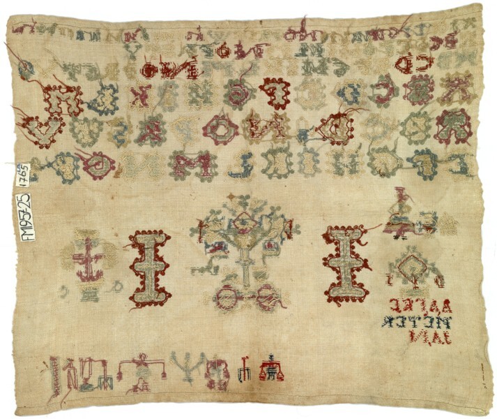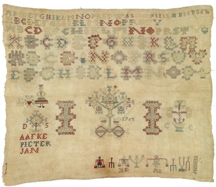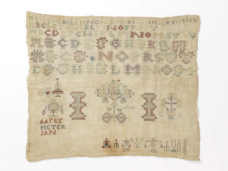 Merkletterlap onaf, met de namen Aafke, Pieter, Jan, gemerkt I.I., 1765