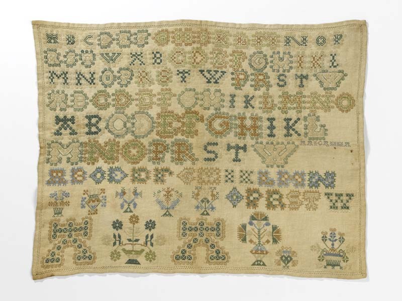 Lettermerklap met rijk versierde letters, gedeeltelijk opengewerkt, in het onderste gedeelte levensbomen, onduidelijke initialen A.A., 1751
