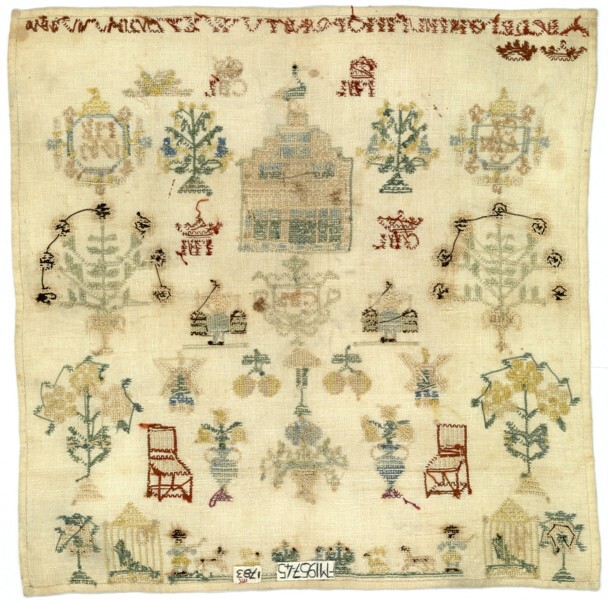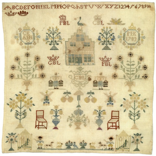 Merkletterlap met ooievaar op huis, gemerkt C.B.L. anno 1783