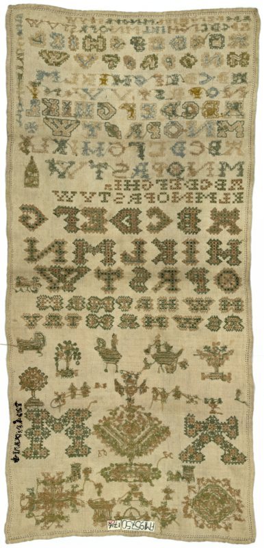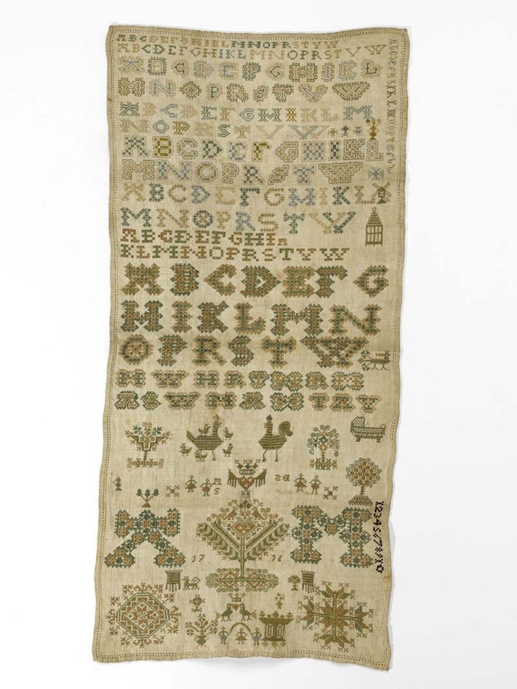 Lettermerklap met haan en kip met kuikens in beige, blauw en groen, gemerkt A.M., 1716