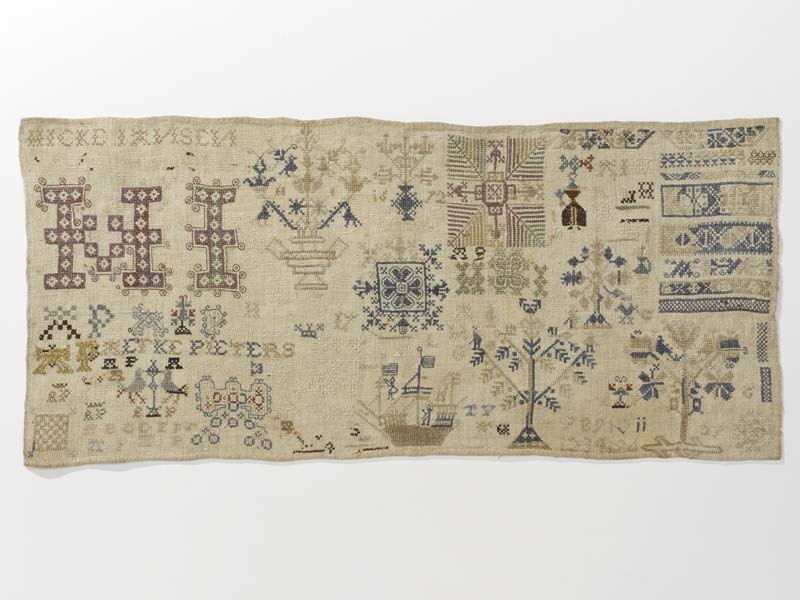 Merklap met rij randmotieven, gemerkt Hicke Jansen en Aefke Pieters, 1672